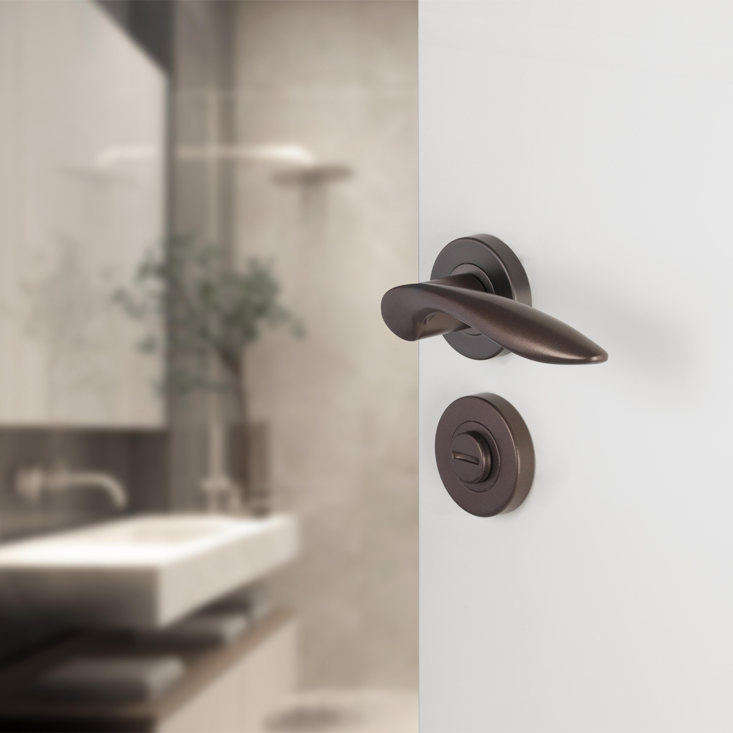 Rond rozet met toiletslot in kleur brons. Per 2 verpakt. Gemaakt van roestvrij staal.