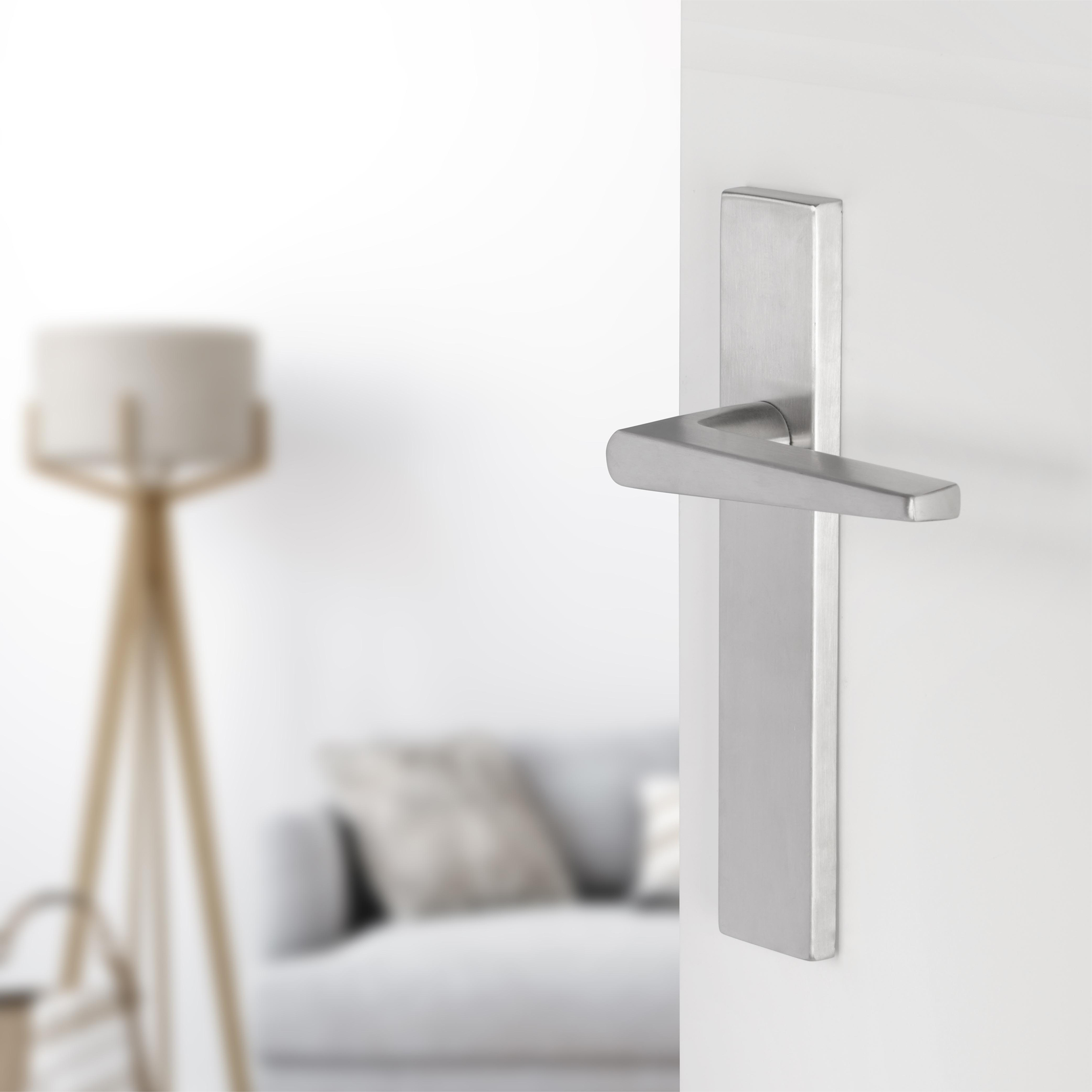 Rechthoekige deurkruk op rechthoekig schild uit de Differnz Rotterdam-serie, blind. Greep bevat driehoekige uitloop. In de kleur mat chroom. Per 2 verpakt in een complete set. Gemaakt van roestvrij staal.