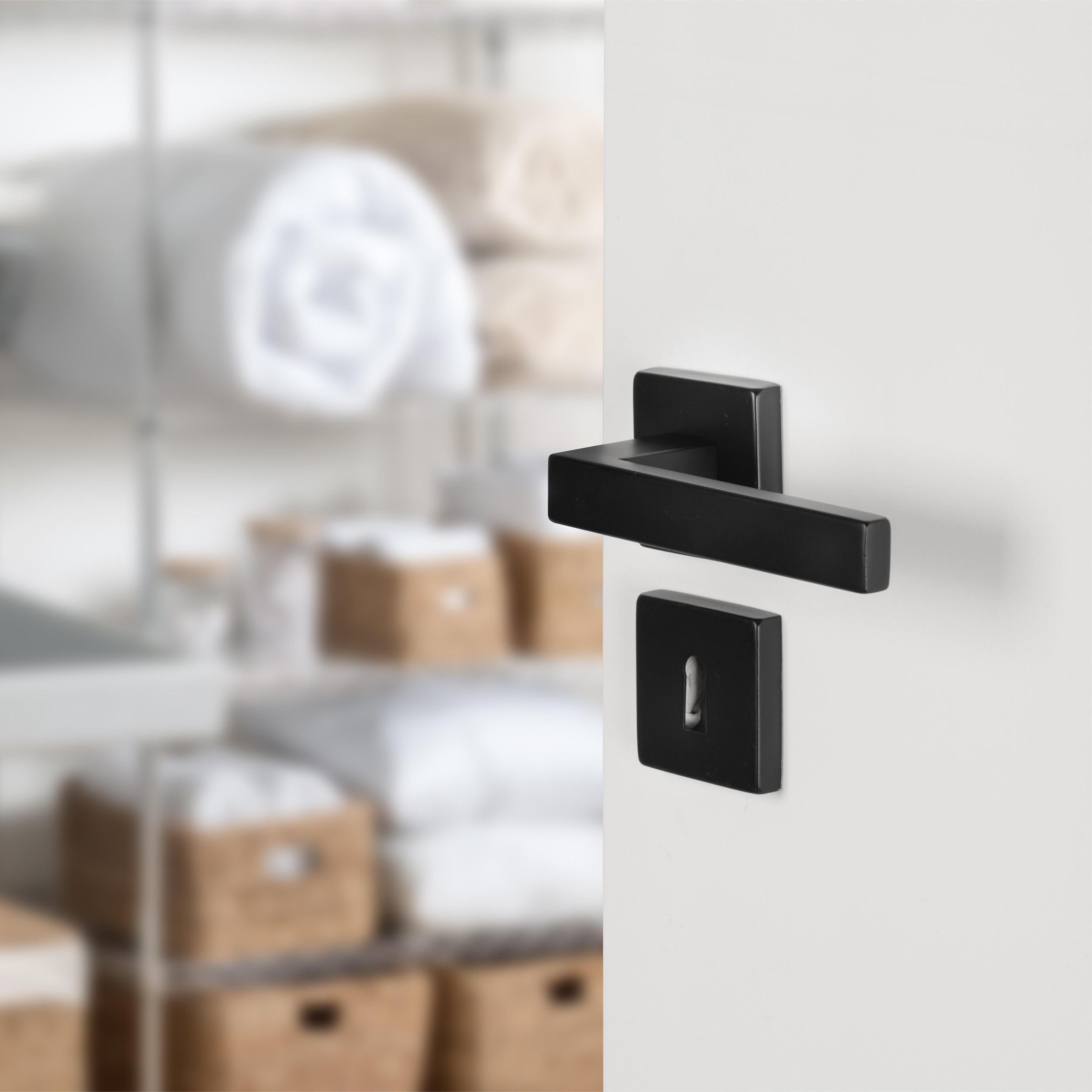 Vierkant rozet met sleutelgat in kleur mat zwart. Per 2 verpakt. Gemaakt van roestvrij staal.
