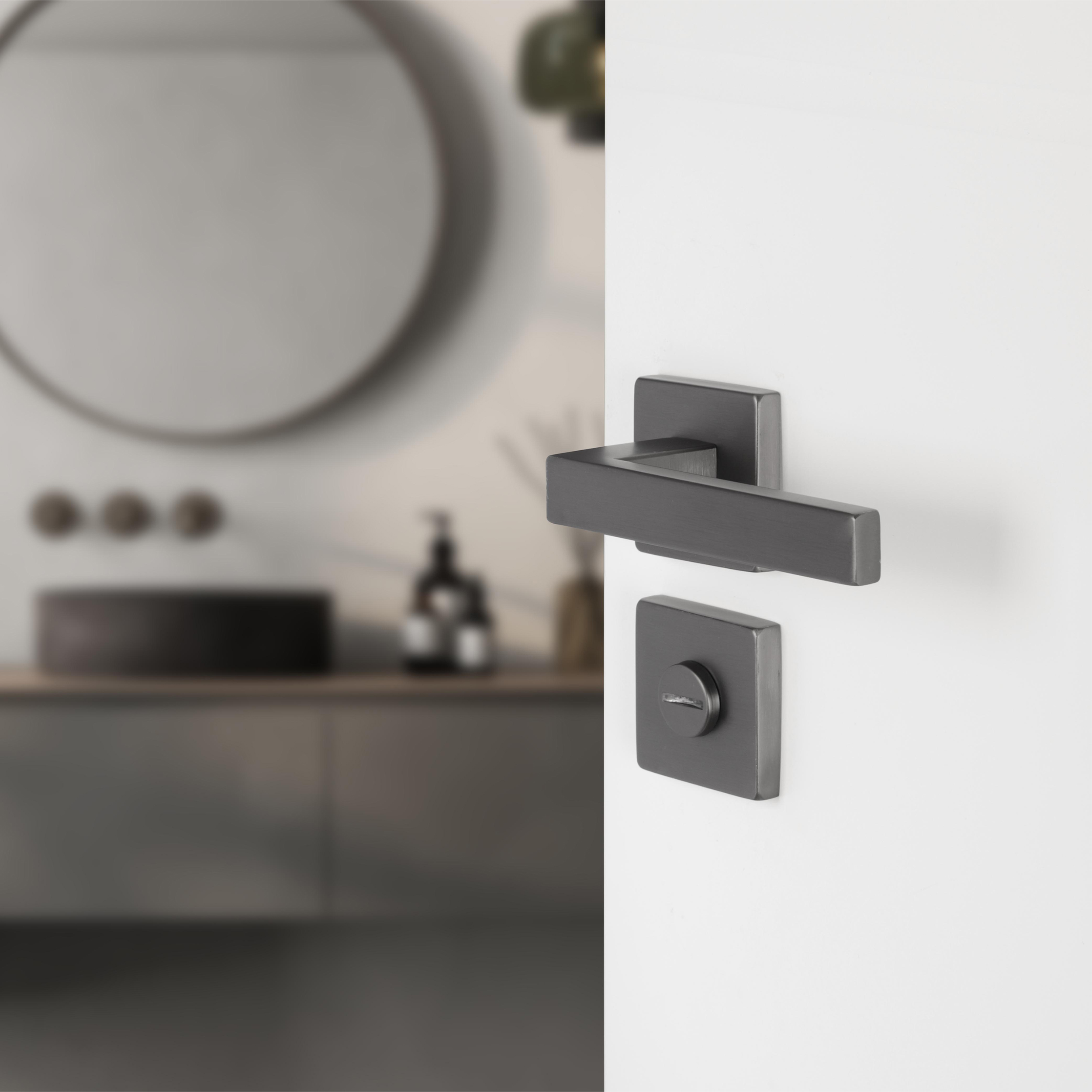Vierkant rozet met toiletslot in kleur gun metal. Per 2 verpakt. Gemaakt van roestvrij staal.