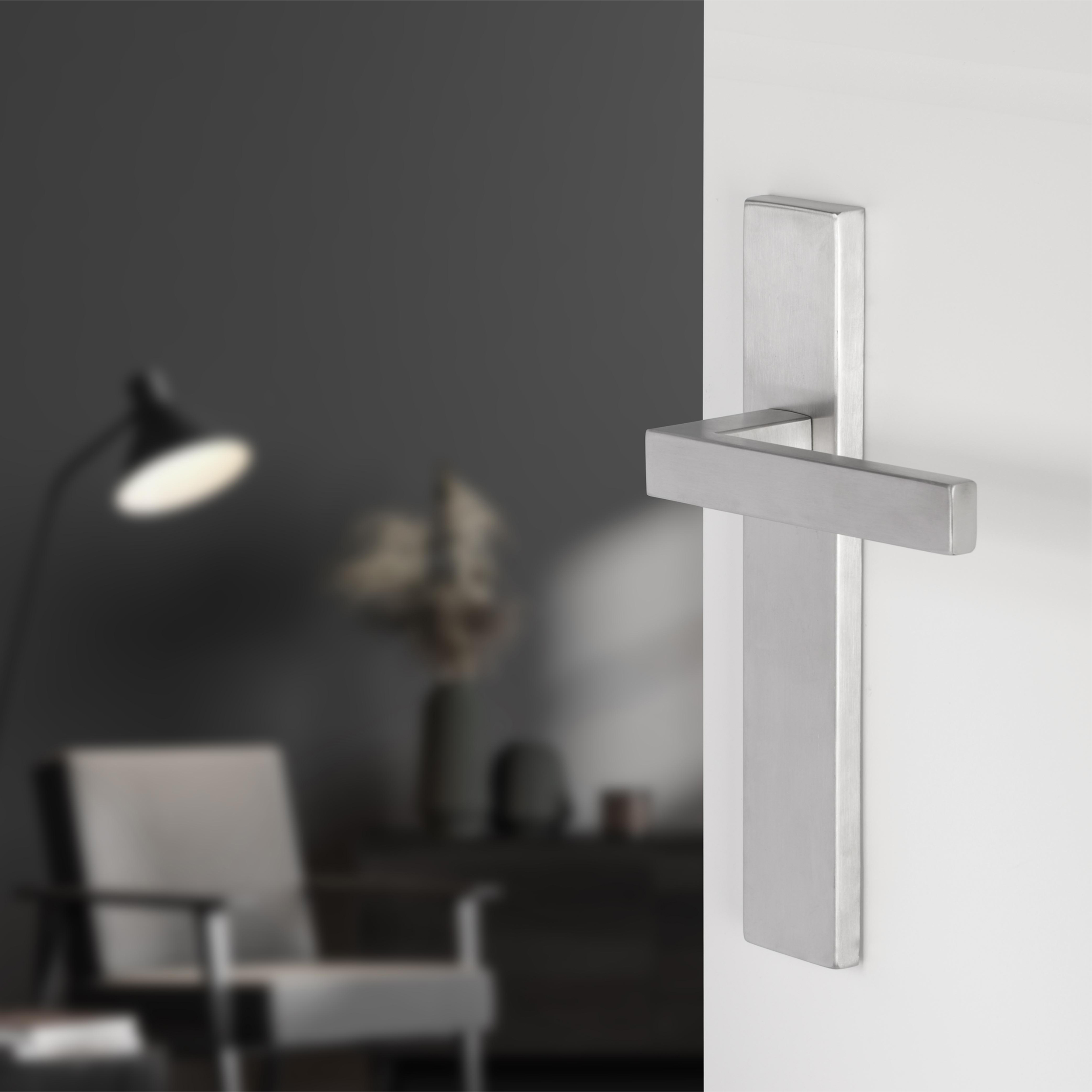 Rechthoekige deurkruk op rechthoekig schild uit de Differnz Tilburg-serie, blind. In de kleur mat chroom. Per 2 verpakt in een complete set. Gemaakt van roestvrij staal.