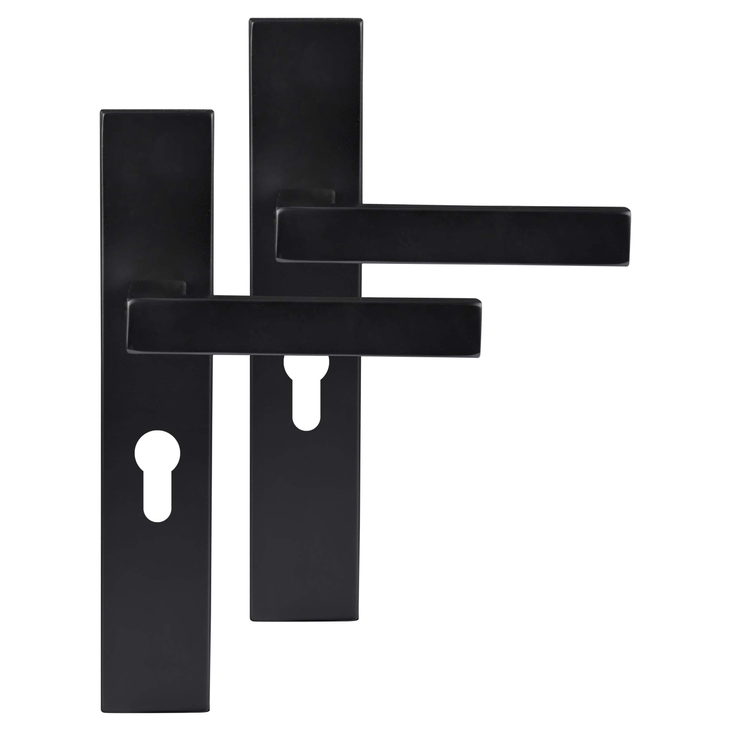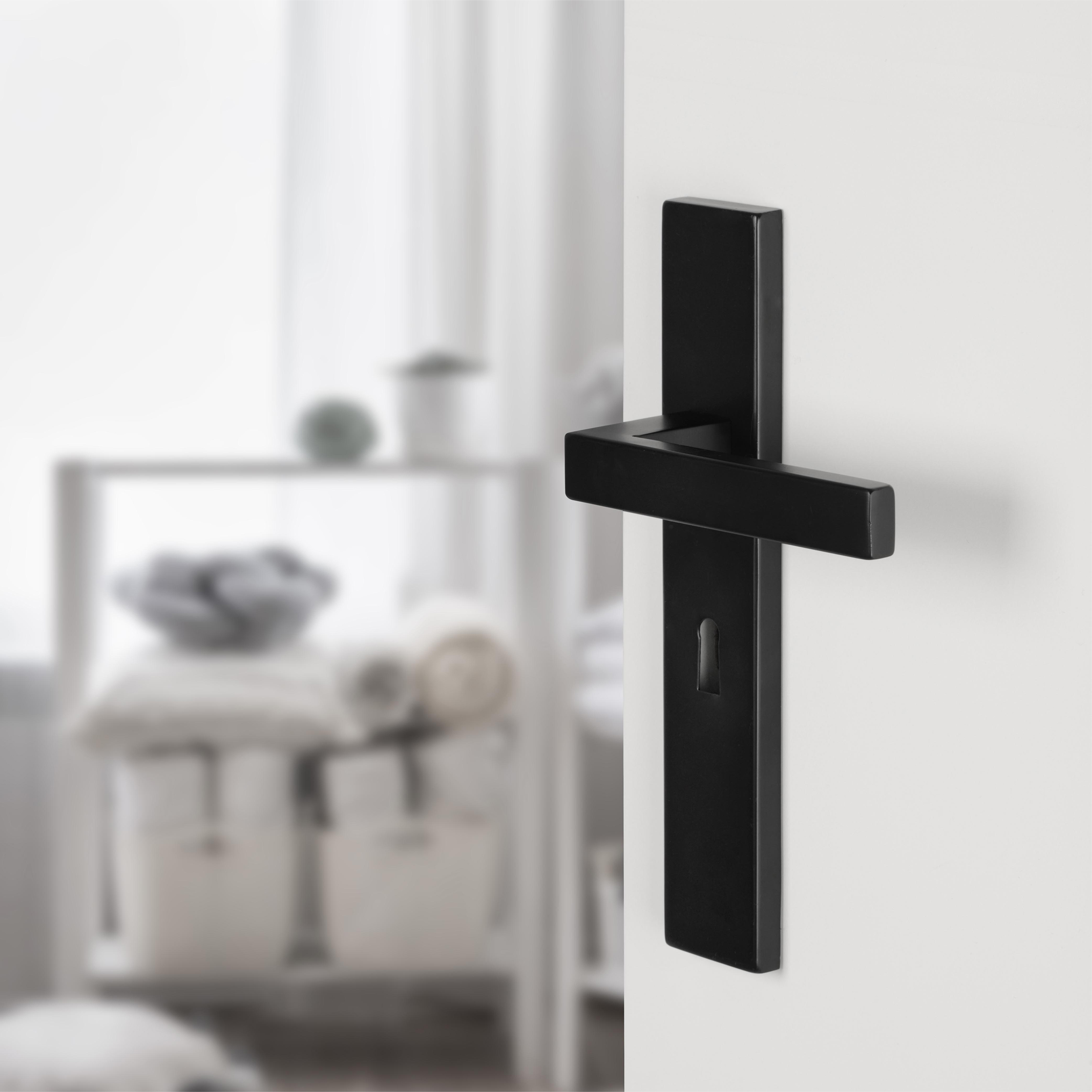 Rechthoekige deurkruk op rechthoekig schild uit de Differnz Tilburg-serie, met cilindergat 55 mm. In de kleur mat zwart. Per 2 verpakt in een complete set. Gemaakt van roestvrij staal.