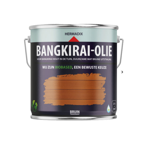 Olie op basis van natuurlijke, hernieuwbare oliën met extra pigment. Het natuurlijke karakter van het hout blijft met BANGKIRAI-OLIE EXTRA behouden en krijgt een mat bruine uitstraling. Zeer diepe indringing in het bangkirai hout; afbladderen is uitgesloten. Hoogwaardige watergedragen olie; bevat geen ander oplosmiddel dan water, is biobased en dus minder milieubelastend. Geen nare verflucht, snel droog, makkelijk verwerkbaar. De transparante mat bruine afwerking geeft uw tuin een extra mooie uitstraling.