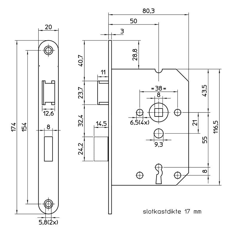 - Afstand krukgat/sleutelgat: 56 mm